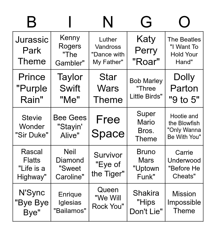 This bingo card has a free space and 39 words: Bon Jovi "Blaze of Glory", Idina Menzel "Let It Go", Beyonce "Single Ladies", Taylor Swift "Me", N'Sync "Bye Bye Bye", Survivor "Eye of the Tiger", Star Wars Theme, Carly Rae Jepson "Call Me Maybe", The Beatles "I Want To Hold Your Hand", Rascal Flatts "Life is a Highway", Bee Gees "Stayin' Alive", Katy Perry "Roar", Mission Impossible Theme, Hootie and the Blowfish "Only Wanna Be With You", Super Mario Bros. Theme, Neil Diamond "Sweet Caroline", Ed Sheeran "Shape of You", Jurassic Park Theme, The Weeknd "Blinding Lights", Bruno Mars "Uptown Funk", Prince "Purple Rain", Queen "We Will Rock You", Bob Marley "Three Little Birds", Dolly Parton "9 to 5", Spice Girls "Wannabe", Adele "Hello", Whitney Houston "I Will Always Love You", Lady Gaga, Bradley Cooper "Shallow", The Rembrandts "I'll Be There for You", Kenny Rogers "The Gambler", Pharrell Williams "Happy", The Police "Every Breath You Take", Luther Vandross "Dance with My Father", Enrique Iglesias "Bailamos", Shakira "Hips Don't Lie", Lee Ann Womack "I Hope You Dance", Carrie Underwood "Before He Cheats", Stevie Wonder "Sir Duke" and Run DMC/Aerosmith "Walk This Way".