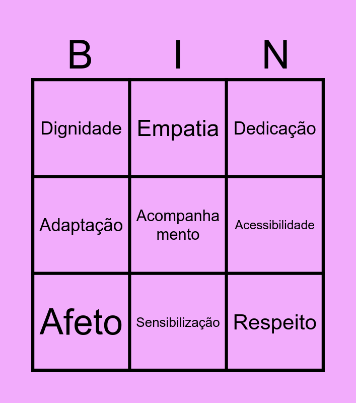 This bingo card has 19 words: Free!, Amor, Dedicação, Acolhimento, Paciência, Acompanha mento, Autonomia, Dignidade, Empatia, Respeito, Inclusão, Acessibilidade, Afeto, Diversidade, Apoio, Empatia, Adaptação, Sensibilização and Solidariedade.