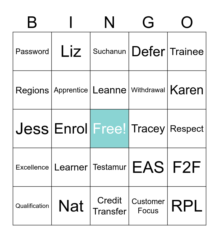 This bingo card has a free space and 34 words: TAFE, Customer Focus, Collaboration, Integrity, Excellence, Apprentice, Trainee, Qualification, Liz, Andria, Leanne, Suchanun, Marilyn, Wendy, Tracey, Karen, Nat, Jess, Learner, EAS, Testamur, Transcript, Password, Respect, Credit Transfer, RPL, Defer, Refund, Withdrawal, Regions, WT2, Enrol, F2F and EBS.
