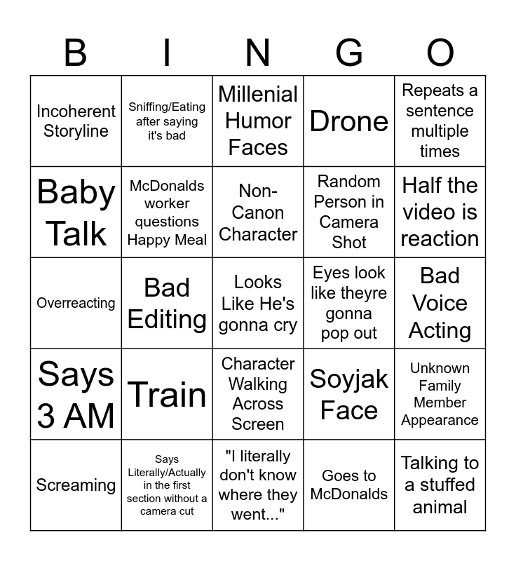 This bingo card has a free space and 60 words: Eating On Camera, Says Literally/Actually in the first section without a camera cut, Mispronounces names, Says 3 AM, Goes to McDonalds, Orders Fruitopia, McDonalds worker questions Happy Meal, Horrible 3D Model, Random Person in Camera Shot, Rambles about nothing, Drone, Gets a call, Baby Talk, Potion, Poppy Playtime, Incoherent Storyline, Talking to a stuffed animal, Repeats a sentence multiple times, Random object in Happy Meal, Non-Canon Character, Eyes look like theyre gonna pop out, Millenial Humor Faces, Screaming, Unknown Family Member Appearance, Asks if it comes with a toy, "If you want it, comment and I'll send it to you", "I literally don't know what this is", Plays with toys, Half the video is reaction, Disgust Over Smell, Transformation, That One Scary SFX™, Stock Sounds, Kevin McLaoed, Sniffing/Eating after saying it's bad, Stolen Content, Captivated by Animation, Bad Editing, AI Voice, Overreacting, EXE Eyes, Train, Bad Voice Acting, Haunted Location, Soyjak Face, Explains what is happening on screen, "I love you" Comment, PNG of the Character, Mentions another video, Character Walking Across Screen, "I literally don't know where they went...", "Wait.." with a focused face, "Let me know in the comments", CRAAAAZY, Questioning the Obvious, Football Field, Commiting A Crime, Says something that can be taken in a pedophelic way, People not seeing the monster and Blatant Misinformation.