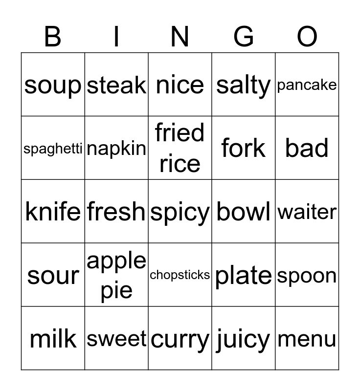 This bingo card has 25 words: apple pie, curry, fried rice, milk, pancake, soup, spaghetti, steak, bowl, chopsticks, fork, knife, plate, spoon, napkin, menu, waiter, nice, bad, fresh, spicy, sweet, sour, salty and juicy.