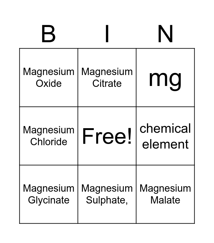 This bingo card has a free space and 8 words: chemical element, mg, Magnesium Citrate, Magnesium Glycinate, Magnesium Oxide, Magnesium Malate, Magnesium Chloride and Magnesium Sulphate,.