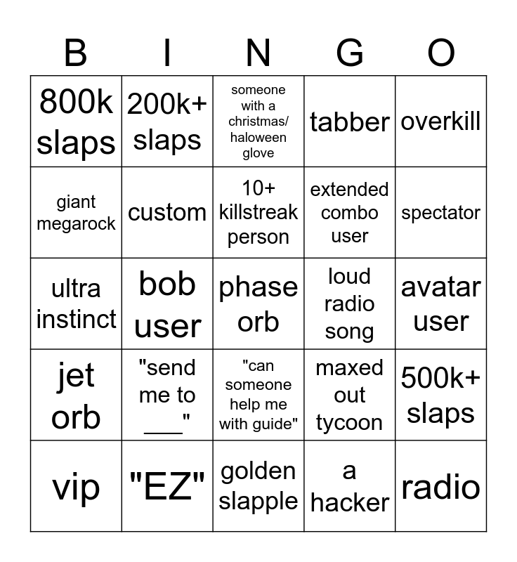 This bingo card has a free space and 24 words: "send me to ___", "EZ", 10+ killstreak person, vip, overkill, 800k slaps, giant megarock, 200k+ slaps, loud radio song, "can someone help me with guide", extended combo user, ultra instinct, maxed out tycoon, 500k+ slaps, custom, a hacker, avatar user, someone with a christmas/ haloween glove, spectator, bob user, radio, jet orb, tabber and golden slapple.