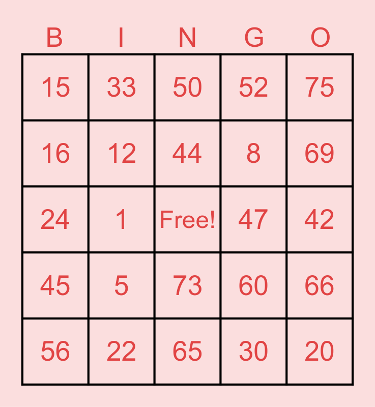 This bingo card has a free space and 24 words: 5, 22, 44, 56, 75, 15, 16, 33, 47, 73, 8, 24, 60, 66, 12, 30, 42, 50, 69, 1, 20, 45, 52 and 65.