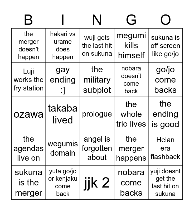 This bingo card has a free space and 24 words: wegumis domain, yuta go/jo or kenjaku come back, the military subplot, sukuna is the merger, sukuna is off screen like go/jo, the merger doesn't happen, Luji works the fry station, hakari vs urame does happen, the whole trio lives, angel is forgotten about, nobara doesn't come back, ozawa, the merger happens, Heian era flashback, gay ending :], nobara come backs, the ending is good, wuji gets the last hit on sukuna, go/jo come backs, takaba lived, yuji doesnt get the last hit on sukuna, the agendas live on, megumi kills himself and jjk 2.