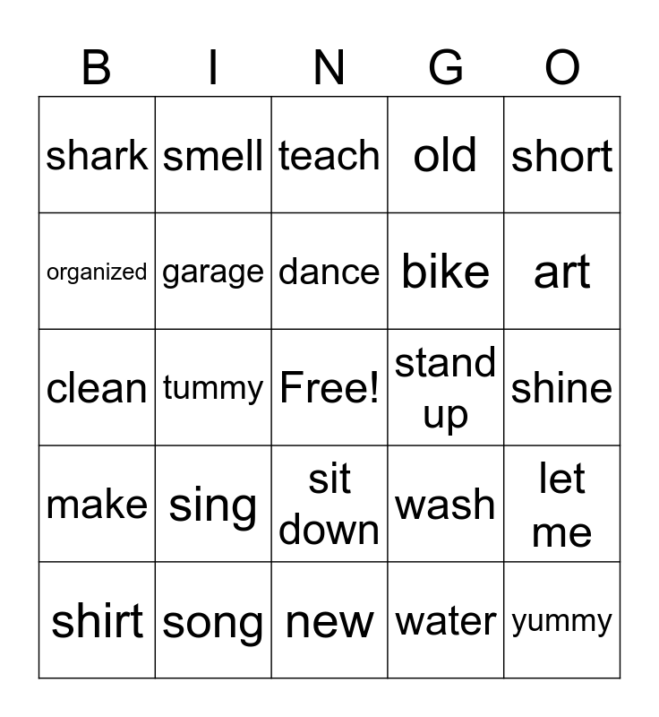 This bingo card has a free space and 24 words: sing, song, dance, shirt, short, shark, organized, smell, stand up, sit down, bike, clean, wash, let me, garage, water, shine, teach, art, tummy, yummy, make, old and new.