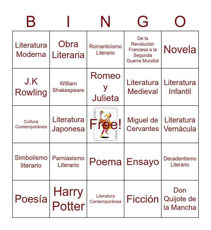 This bingo card has a free space and 29 words: Poesía, Hamlet, Literatura Japonesa, Poema de Gilgamesh, Literatura Moderna, Romanticismo Literario, William Shakespeare, Parniasismo Literario, Miguel de Cervantes, Harry Potter, Literatura Vernácula, Don Quijote de la Mancha, Literatura Contemporánea, Ficción, Literatura Infantil, Isabelle Allende, Poema, Simbolismo literario, Novela, Cultura Contemporánea, Ensayo, Odisea, Literatura Medieval, J.K Rowling, De la Revolución Francesa a la Segunda Guerra Mundial, Obra Literaria, Decadentismo Literario, Romeo y Julieta and Realismo.
