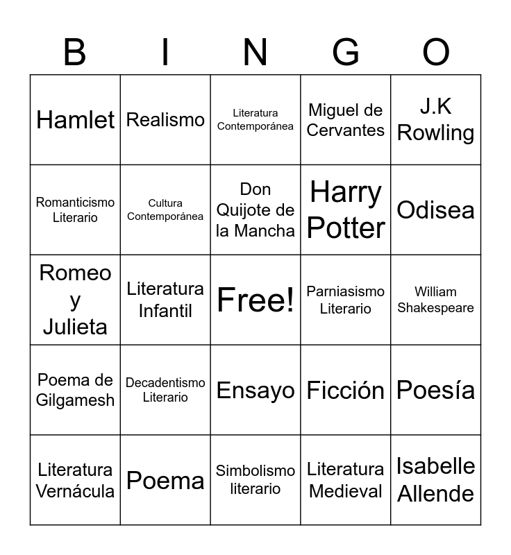 This bingo card has a free space and 24 words: Decadentismo Literario, Poema, Don Quijote de la Mancha, Literatura Vernácula, J.K Rowling, Hamlet, Romanticismo Literario, Realismo, Parniasismo Literario, Ensayo, Harry Potter, Romeo y Julieta, Ficción, Poesía, Cultura Contemporánea, Literatura Medieval, William Shakespeare, Literatura Contemporánea, Odisea, Literatura Infantil, Isabelle Allende, Poema de Gilgamesh, Miguel de Cervantes and Simbolismo literario.