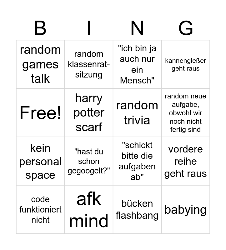 This bingo card has 16 words: afk mind, vordere reihe geht raus, "ich bin ja auch nur ein Mensch", random games talk, kein personal space, random klassenrat- sitzung, "schickt bitte die aufgaben ab", bücken flashbang, Free!, harry potter scarf, code funktioniert nicht, kannengießer geht raus, "hast du schon gegoogelt?", random neue aufgabe, obwohl wir noch nicht fertig sind, random trivia and babying.