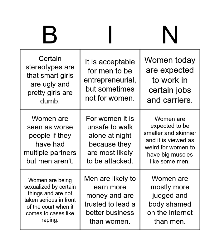 This bingo card has a free space and 8 words: Women are expected to be smaller and skinnier and it is viewed as weird for women to have big muscles like some men., Women today are expected to work in certain jobs and carriers., It is acceptable for men to be entrepreneurial, but sometimes not for women., Women are being sexualized by certain things and are not taken serious in front of the court when it comes to cases like raping., Certain stereotypes are that smart girls are ugly and pretty girls are dumb., Women are mostly more judged and body shamed on the internet than men., Women are seen as worse people if they have had multiple partners but men aren‘t. and Men are likely to earn more money and are trusted to lead a better business than women..