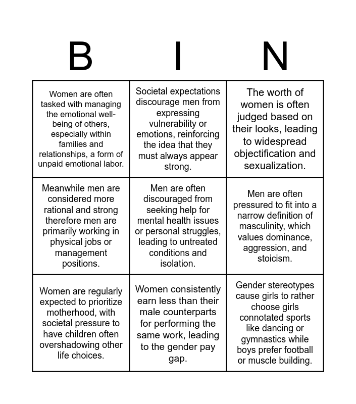 This bingo card has 9 words: Women are regularly expected to prioritize motherhood, with societal pressure to have children often overshadowing other life choices., The worth of women is often judged based on their looks, leading to widespread objectification and sexualization., Societal expectations discourage men from expressing vulnerability or emotions, reinforcing the idea that they must always appear strong., Meanwhile men are considered more rational and strong therefore men are primarily working in physical jobs or management positions., Women are often tasked with managing the emotional well-being of others, especially within families and relationships, a form of unpaid emotional labor., Men are often pressured to fit into a narrow definition of masculinity, which values dominance, aggression, and stoicism., Men are often discouraged from seeking help for mental health issues or personal struggles, leading to untreated conditions and isolation., Gender stereotypes cause girls to rather choose girls connotated sports like dancing or gymnastics while boys prefer football or muscle building. and Women consistently earn less than their male counterparts for performing the same work, leading to the gender pay gap..