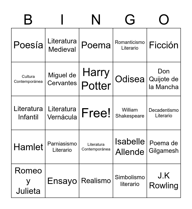 This bingo card has a free space and 24 words: Parniasismo Literario, Ensayo, Harry Potter, Romeo y Julieta, Ficción, Poesía, Cultura Contemporánea, Literatura Medieval, William Shakespeare, Literatura Contemporánea, Odisea, Literatura Infantil, Isabelle Allende, Poema de Gilgamesh, Miguel de Cervantes, Simbolismo literario, Decadentismo Literario, Poema, Don Quijote de la Mancha, Literatura Vernácula, J.K Rowling, Hamlet, Romanticismo Literario and Realismo.