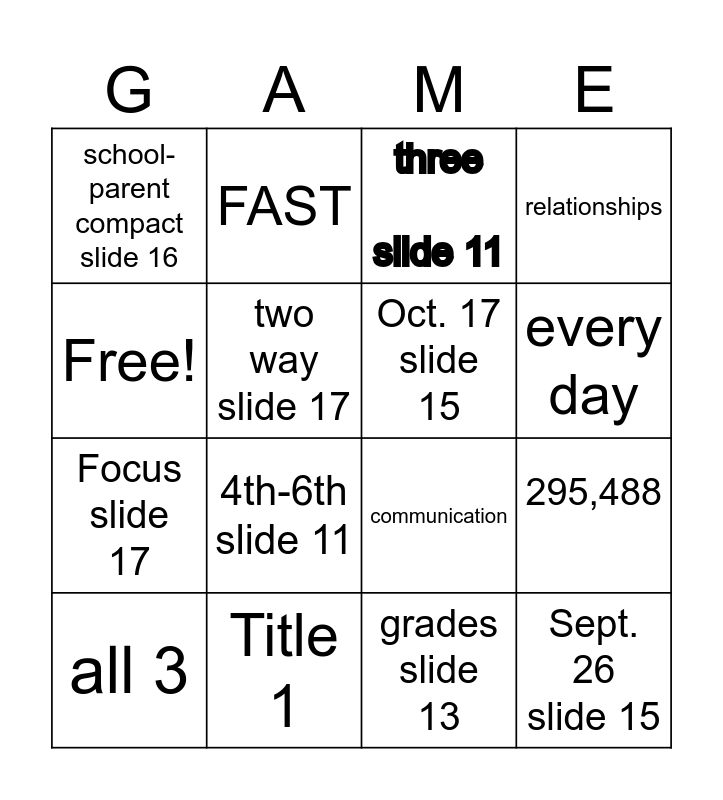 This bingo card has 16 words: Title 1, 295,488, three slide 11, school-parent compact slide 16, Focus slide 17, FAST, communication, grades slide 13, Free!, two way slide 17, all 3, relationships, 4th-6th slide 11, every day, Oct. 17 slide 15 and Sept. 26 slide 15.