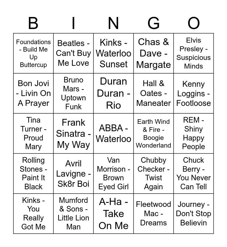 This bingo card has 51 words: Free!, ABBA - Waterloo, ABC - The Look Of Love, A-Ha - Take On Me, Avril Lavigne - Sk8r Boi, Bangles - Walk Like An Egyptian, Beatles - Can't Buy Me Love, Bee Gees - Tragedy, Bon Jovi - Livin On A Prayer, Bruce Springsteen - Dancing In The Dark, Bruno Mars - Uptown Funk, Chas & Dave - Margate, Chuck Berry - You Never Can Tell, Chubby Checker - Twist Again, Dexys Midnight Runners - Come On Eileen, Don McLean - American Pie, Duran Duran - Rio, Earth Wind & Fire - Boogie Wonderland, Elton John - I'm Still Standing, Elvis Presley - Suspicious Minds, Frank Sinatra - My Way, Fleetwood Mac - Dreams, Foundations - Build Me Up Buttercup, Hall & Oates - Maneater, Jacksons - Blame It On The Boogie, Journey - Don't Stop Believin, Kenny Loggins - Footloose, Killers - Human, Kinks - You Really Got Me, Kinks - Waterloo Sunset, Linkin Park - Numb, Lynyrd Skynyrd - Sweet Home Alabama, Madonna - Like A Prayer, Maroon5 - Moves Like Jagger, Michael Jackson - Bad, Mumford & Sons - Little Lion Man, Oasis - Champagne Supernova, Paolo Nutini - Last Request, Prince - Raspberry Beret, Queen - Somebody To Love, REM - Shiny Happy People, Rolling Stones - Paint It Black, Shania Twain - That Don't Impress Me Much, Sofie Ellis Bextor - Murder On The Dancefloor, Stevie Nicks - Edge of Seventeen, Supremes - Stop! In The Name Of Love, Tina Turner - Proud Mary, Tom Petty - American Girl, Ultravox - Vienna, Van Morrison - Brown Eyed Girl and Wheatus - Teenage Dirtbag.