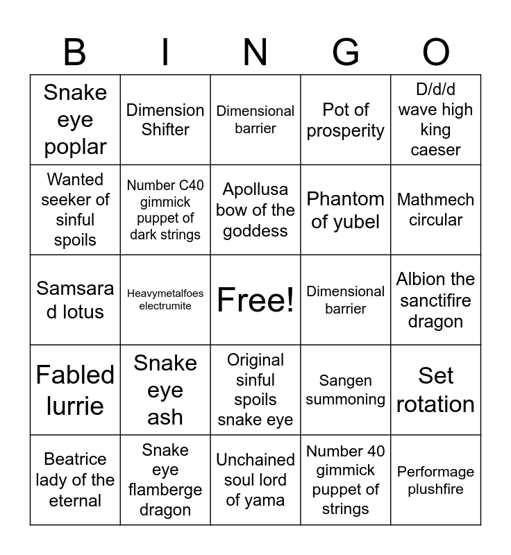 This bingo card has a free space and 24 words: Snake eye ash, Snake eye flamberge dragon, Apollusa bow of the goddess, Beatrice lady of the eternal, D/d/d wave high king caeser, Snake eye poplar, Wanted seeker of sinful spoils, Dimension Shifter, Dimensional barrier, Original sinful spoils snake eye, Phantom of yubel, Samsara d lotus, Sangen summoning, Set rotation, Number C40 gimmick puppet of dark strings, Number 40 gimmick puppet of strings, Albion the sanctifire dragon, Dimensional barrier, Mathmech circular, Heavymetalfoes electrumite, Performage plushfire, Fabled lurrie, Pot of prosperity and Unchained soul lord of yama.