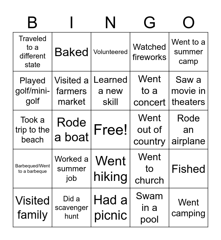 This bingo card has a free space and 28 words: Fished, Spent time in an amusement park, Went to a concert, Swam in a pool, Played golf/mini-golf, Volunteered, Baked, Barbequed/Went to a barbeque, Went out of country, Visited family, Took a trip to the beach, Watched fireworks, Did a scavenger hunt, Had a picnic, Saw a movie in theaters, Planted something, Worked a summer job, Visited a farmers market, Learned a new skill, Went hiking, Traveled to a different state, Paid a visit to a museum, Went camping, Rode a boat, Rode an airplane, Went to church, Went to a summer camp and Ate S'mores.
