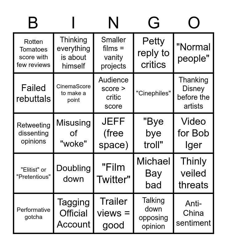 This bingo card has a free space and 69 words: Long-winded Facebook post, Video for Bob Iger, Nonsensical Insult, Hashtags in replies, Tagging Official Account, Casual racism, Petty reply to critics, "Ignore this person", "Normal people", Box office = good, Thinly veiled threats, Blackout after fact-checking, Rotten Tomatoes score with few reviews, Smaller films = vanity projects, Plagiarism, Misusing of "woke", "Film Twitter", "Cinephiles", Regular Show memes, "Elitist" or "Pretentious", "Bye bye troll", Michael Bay bad, Thanking Disney before the artists, Anti-union rhetoric, Casual transphobia, No self-awareness, Taking a joke seriously, Profile stalking, Talking down opposing opinion, Casual ableism, Thinking everything is about himself, Incoherent political stances, "Capitalism is great", Misuse of "far-left", New burner account, "Both sides", Casual antisemitism, Pauses in text, Failed rebuttals, Death wishes, Doubling down, Anti-China sentiment, I'm right, everyone else is wrong, Anti-Palestinian sentiment, Overuse of hashtags, Performative gotcha, "General audiences", Overdone swearing, Snitch tagging, CinemaScore to make a point, Audience score > critic score, Speaking for the "average moviegoer", Attention = good, Trailer views = good, Talking like a cartoon villain monologue, Blatant hypocrisy, Leaving conversations when he thinks he won, Deleting replies, Claiming the moral high ground, Retweeting dissenting opinions, "From your point of view", Jumping into conversations unprompted, Auteurs = bad, Trusting unreliable/debunked sources, Inconsistent opinions, Word salad replies, Entering conversations through multiple accounts, Shilling business executives and Comparing movie opinions to social justice movements.