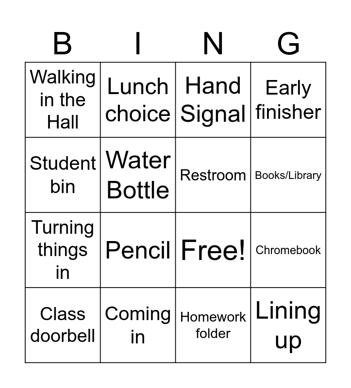 This bingo card has 22 words: Coming in, Morning work, Lunch choice, Attendance, Water Bottle, Restroom, Walking in the Hall, Hand Signal, Free!, Lining up, Turning things in, Early finisher, Mailbox, Friday folder, Homework folder, Homework, Chromebook, Class doorbell, Pencil, Student bin, Books/Library and Dismissal.