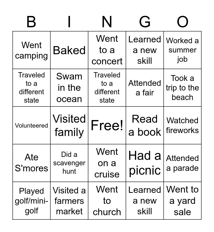 This bingo card has a free space and 24 words: Did a scavenger hunt, Visited a farmers market, Traveled to a different state, Played golf/mini-golf, Worked a summer job, Went camping, Traveled to a different state, Baked, Read a book, Went on a cruise, Attended a fair, Volunteered, Had a picnic, Attended a parade, Swam in the ocean, Learned a new skill, Watched fireworks, Went to a concert, Took a trip to the beach, Visited family, Went to a yard sale, Ate S'mores, Learned a new skill and Went to church.