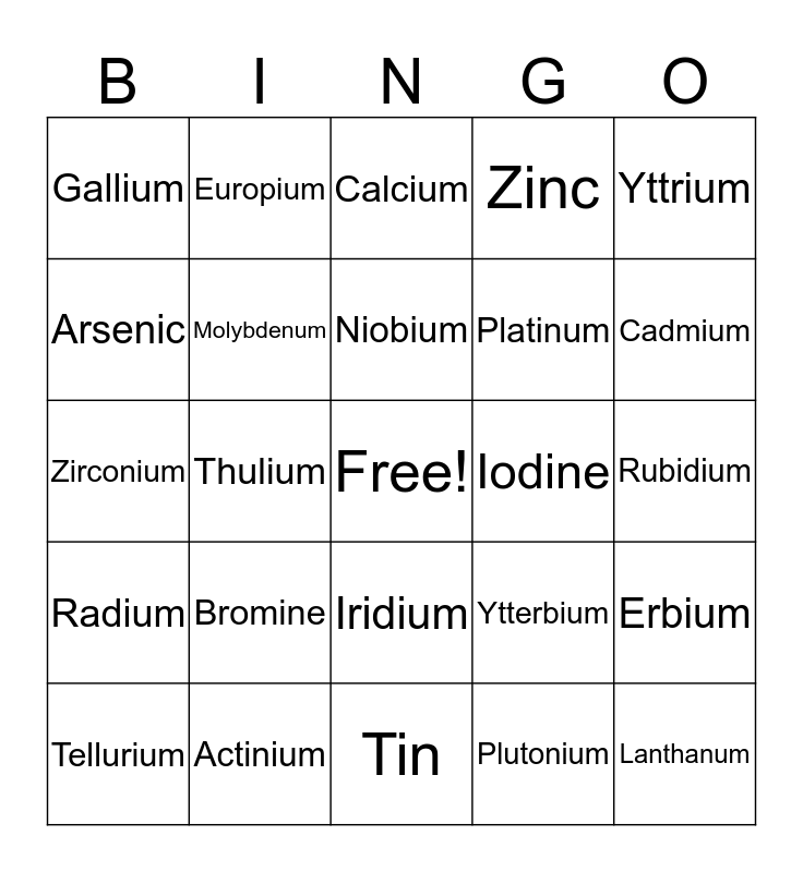 This bingo card has a free space and 80 words: Argon, Potassium, Calcium, Scandium, Titanium, Vanadium, Chromium, Manganese, Iron, Cobalt, Nickel, Copper, Zinc, Gallium, Germanium, Arsenic, Selenium, Bromine, Krypton, Rubidium, Strontium, Yttrium, Zirconium, Niobium, Molybdenum, Technetium, Ruthenium, Rhodium, Palladium, Silver, Cadmium, Indium, Tin, Antimony, Tellurium, Iodine, Xenon, Cesium, Barium, Lanthanum, Cerium, Praseodymium, Neodymium, Promethium, Samarium, Europium, Gadolinium, Terbium, Dysprosium, Holmium, Erbium, Thulium, Ytterbium, Lutetium, Hafnium, Tantalum, Tungsten, Rhenium, Osmium, Iridium, Platinum, Gold, Mercury, Thallium, Lead, Bismuth, Polonium, Astatine, Radon, Francium, Radium, Actinium, Thorium, Protactinium, Uranium, Neptunium, Plutonium, Americium, Curium and Berkelium.