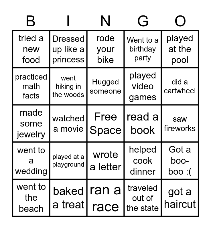 This bingo card has a free space and 29 words: went to the beach, lost a tooth, watched a movie, went to the library, tried a new food, rode your bike, went hiking in the woods, played at a playground, read a book, baked a treat, saw fireworks, got a haircut, ran a race, traveled out of the state, did a cartwheel, went to Church, wrote a letter, went to a wedding, played at the pool, made some jewelry, helped cook dinner, had a birthday over the summer, played video games, practiced math facts, Went to a birthday party, Dressed up like a princess, Got a boo-boo :(, Hugged someone and Played with chalk.