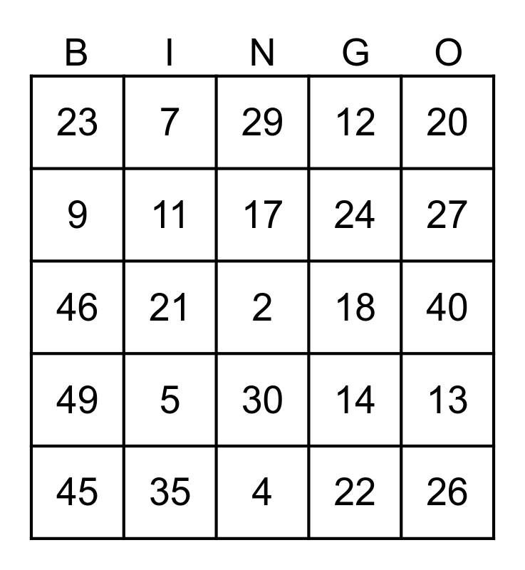 Number Bingo Card