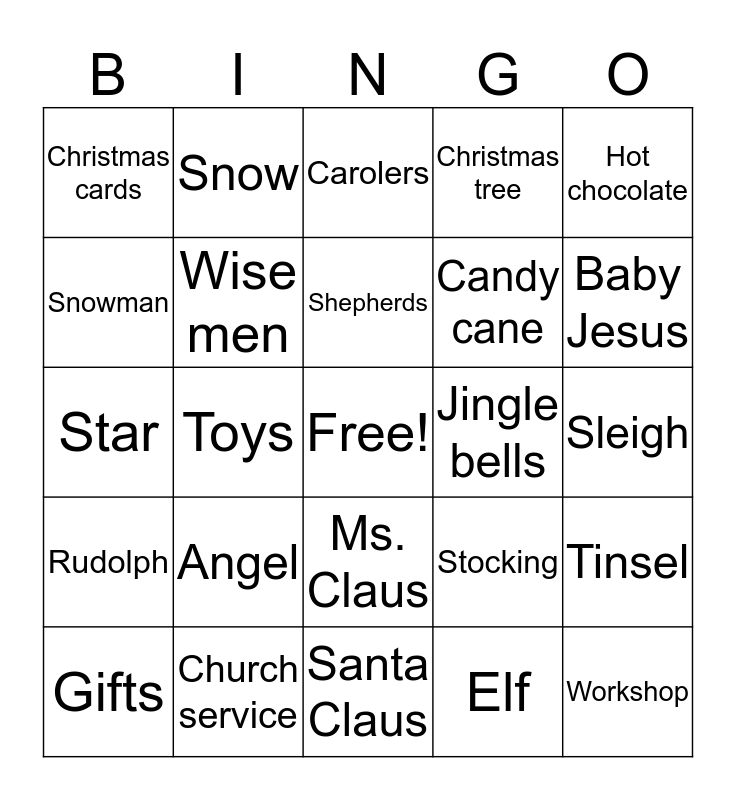 This bingo card has a free space and 27 words: Stocking, Ornament, Candy cane, Santa Claus, Snowman, Carolers, Snow, Rudolph, Jingle bells, Tinsel, Star, Christmas tree, Gifts, Church service, Baby Jesus, Manger, Wise men, Shepherds, Angel, Christmas cards, Sleigh, Elf, Toys, Workshop, Ms. Claus, Hot chocolate and Cookies.