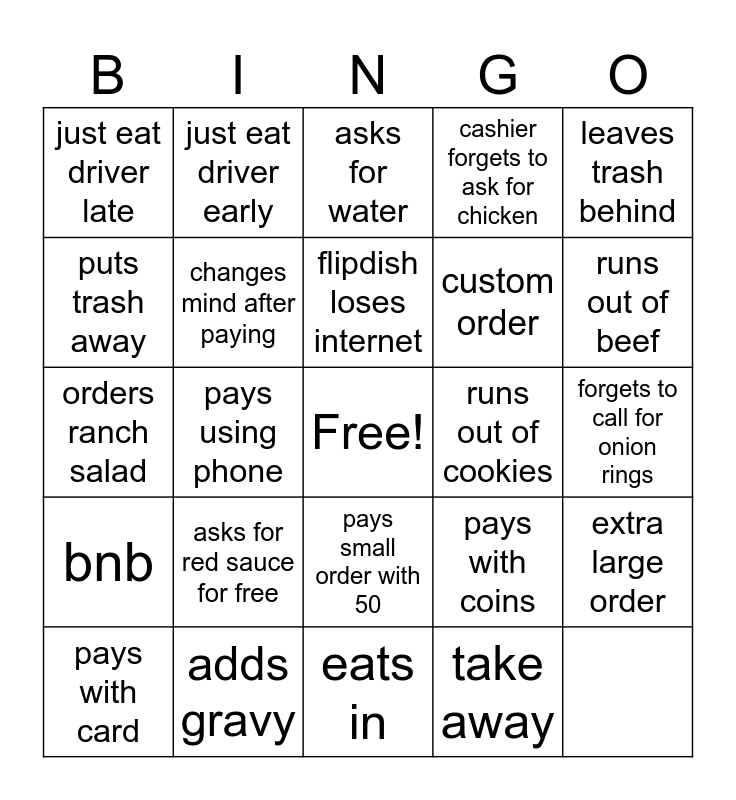 This bingo card has a free space and 24 words: bnb, adds gravy, pays small order with 50, pays with coins, leaves trash behind, just eat driver late, just eat driver early, asks for water, custom order, extra large order, puts trash away, changes mind after paying, asks for something we dont have, runs out of cookies, runs out of beef, pays with card, pays using phone, flipdish loses internet, cashier forgets to ask for chicken, forgets to call for onion rings, orders ranch salad, asks for red sauce for free, eats in and take away.