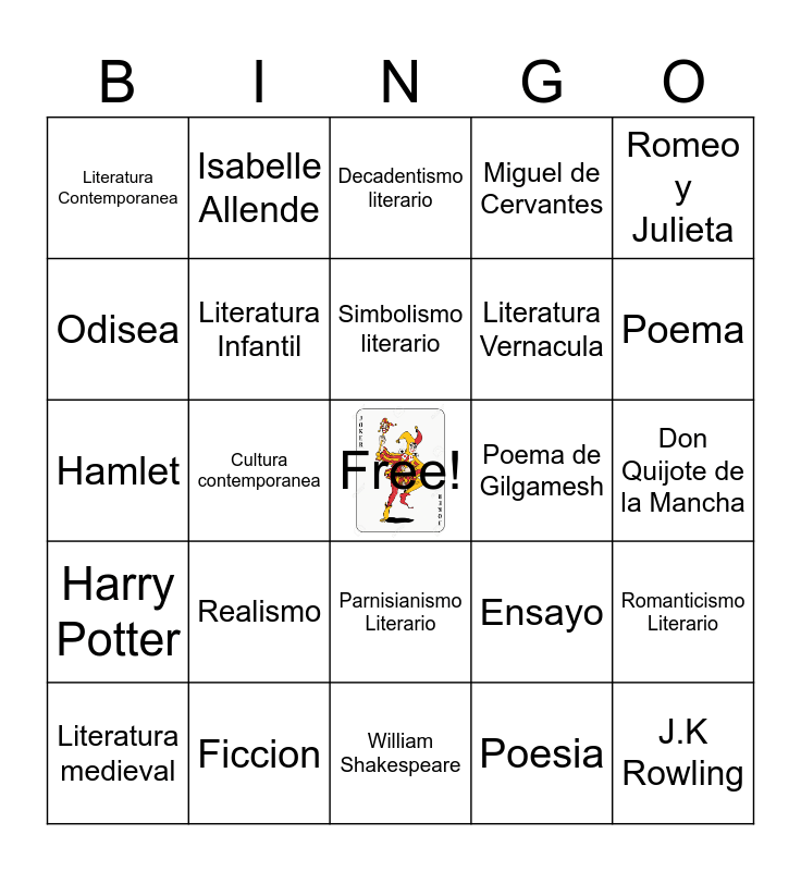 This bingo card has a free space and 24 words: Realismo, Ficcion, Simbolismo literario, Literatura medieval, Romeo y Julieta, Literatura Contemporanea, Odisea, Isabelle Allende, Poema de Gilgamesh, Parnisianismo Literario, Literatura Vernacula, Hamlet, Ensayo, Romanticismo Literario, Literatura Infantil, Poesia, Don Quijote de la Mancha, Decadentismo literario, Poema, Cultura contemporanea, J.K Rowling, Harry Potter, Miguel de Cervantes and William Shakespeare.