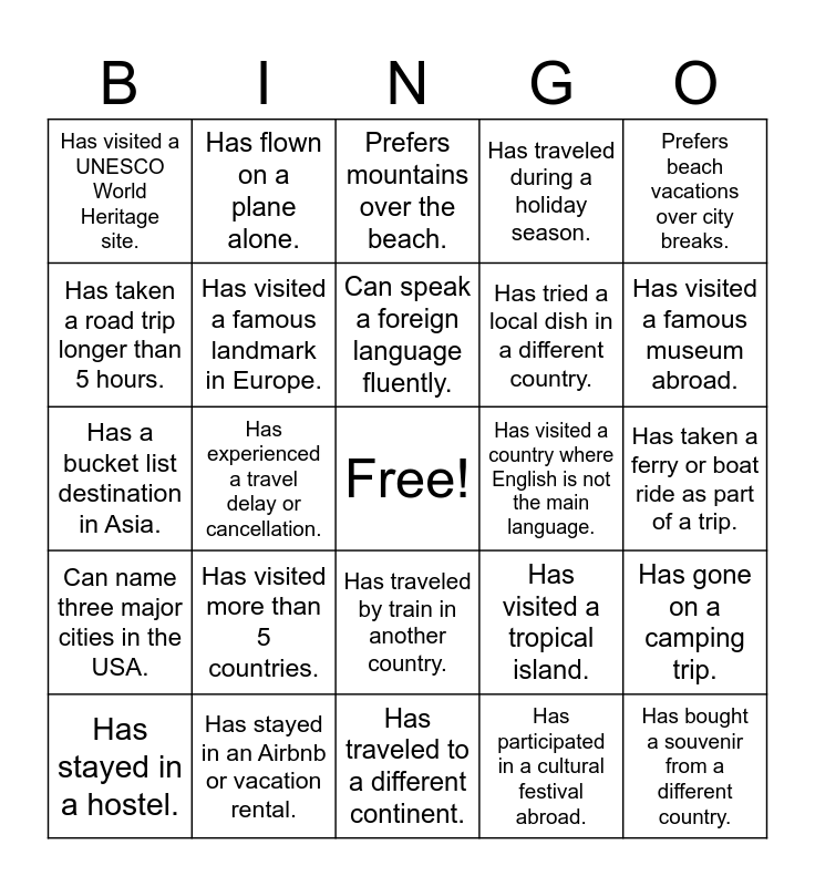 This bingo card has a free space and 25 words: Has visited more than 5 countries., Has traveled to a different continent., Can speak a foreign language fluently., Has stayed in a hostel., Prefers beach vacations over city breaks., Has visited a UNESCO World Heritage site., Has taken a road trip longer than 5 hours., Has flown on a plane alone., Has visited a country where English is not the main language., Has traveled by train in another country., Has tried a local dish in a different country., Has a bucket list destination in Asia., Has visited a tropical island., Has gone on a camping trip., Has visited a famous landmark in Europe., Has experienced jet lag., Has taken a ferry or boat ride as part of a trip., Prefers mountains over the beach., Has visited a famous museum abroad., Has experienced a travel delay or cancellation., Has bought a souvenir from a different country., Has stayed in an Airbnb or vacation rental., Can name three major cities in the USA., Has traveled during a holiday season. and Has participated in a cultural festival abroad..