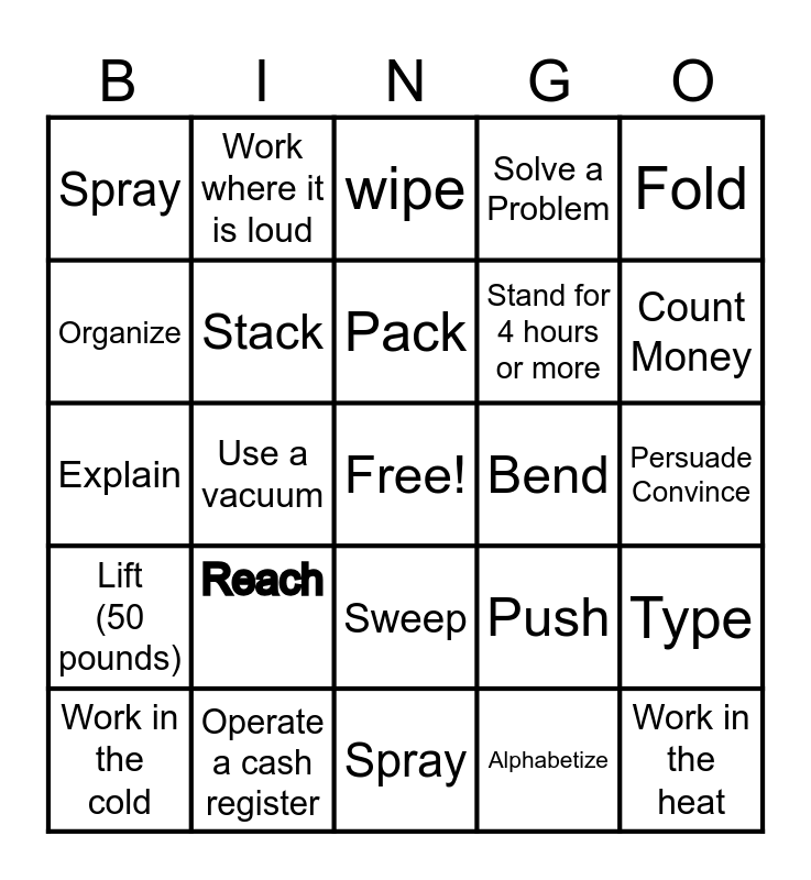 This bingo card has a free space and 24 words: Reach, Operate a cash register, Pack, Work in the cold, Fold, Spray, Organize, Work where it is loud, Bend, Sweep, Stand for 4 hours or more, Explain, Push, Type, Stack, Alphabetize, Persuade Convince, wipe, Count Money, Use a vacuum, Work in the heat, Lift (50 pounds), Solve a Problem and Spray.