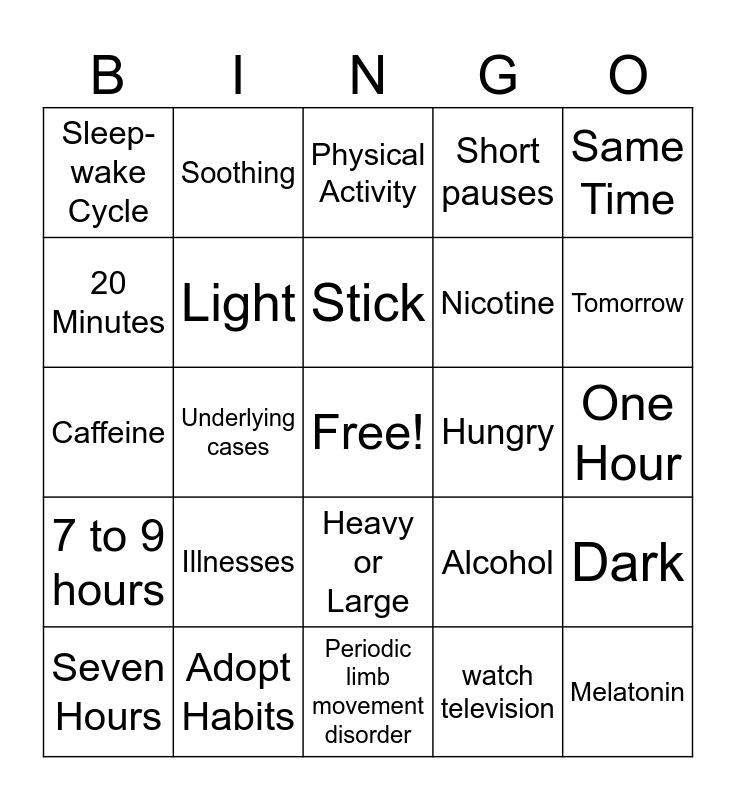This bingo card has a free space and 24 words: Illnesses, Adopt Habits, Stick, Seven Hours, Same Time, Sleep-wake Cycle, 20 Minutes, Soothing, Hungry, Heavy or Large, Nicotine, Caffeine, Alcohol, Dark, Light, watch television, One Hour, Physical Activity, Tomorrow, Underlying cases, Melatonin, 7 to 9 hours, Short pauses and Periodic limb movement disorder.