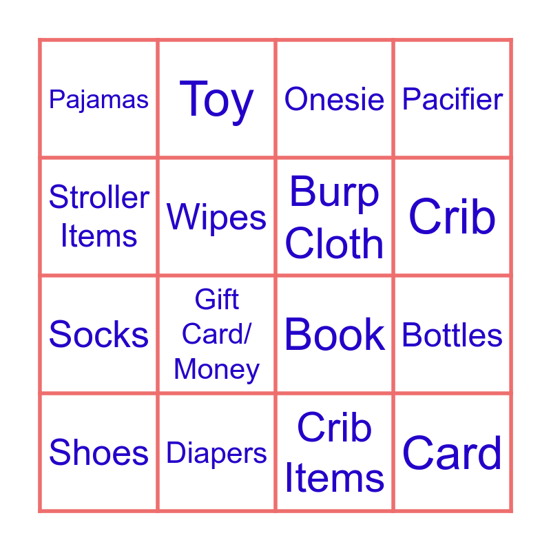 This bingo card has 16 words: Diapers, Bottles, Onesie, Pajamas, Socks, Toy, Book, Crib Items, Stroller Items, Wipes, Shoes, Pacifier, Gift Card/ Money, Crib, Burp Cloth and Card.