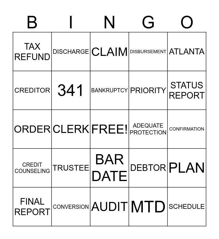 This bingo card has a free space and 42 words: ATTORNEY, BANKRUPTCY, PETITION, TRUSTEE, MTD, PLAN, SCHEDULE, DOCKET, CLAIM, BAR DATE, CONFIRMATION, STATUS REPORT, CLERK, ATLANTA, ROME, DEBTOR, OBJECTION, ORDER, AMENDMENT, DISCHARGE, CREDITOR, COURT, SCAN, TAX REFUND, EXTENSION, COMPOSITION, PRIORITY, UNSECURED, ACP, COMPENSATION, DECLARATION, CREDIT COUNSELING, 341, AUDIT, TRANSFER, FINAL REPORT, CONVERSION, ADEQUATE PROTECTION, AFFIDAVIT, NORTHERN DISTRICT, DISBURSEMENT and JUDGMENT.