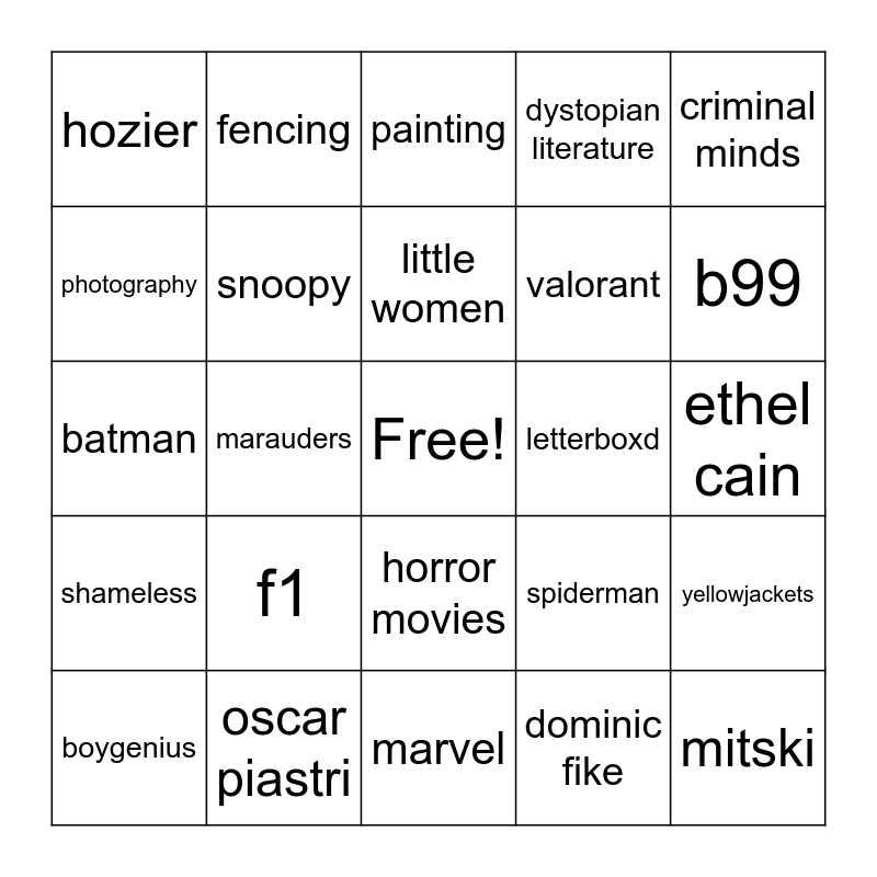 This bingo card has a free space and 24 words: f1, oscar piastri, little women, boygenius, criminal minds, hozier, photography, fencing, letterboxd, horror movies, valorant, batman, spiderman, yellowjackets, snoopy, dominic fike, ethel cain, painting, b99, marauders, mitski, shameless, dystopian literature and marvel.