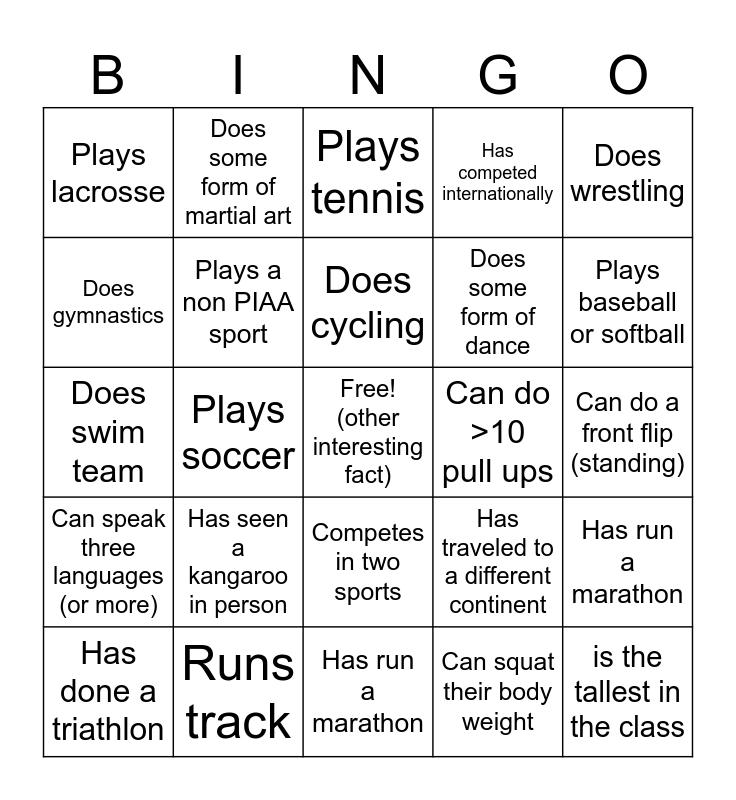 This bingo card has a free space and 30 words: Runs track, Plays football, Plays soccer, Plays Field hockey, Plays lacrosse, Plays tennis, Plays a non PIAA sport, Competes in two sports, Can do >10 pull ups, Has run a marathon, Can do a front flip (standing), is the tallest in the class, Can squat their body weight, Has competed at the national level, Plays baseball or softball, Can touch the ceiling in this room, Has traveled to a different continent, Can speak three languages (or more), Has seen a kangaroo in person, Does wrestling, Does swim team, Does Cheer, Does some form of martial art, Does some form of dance, Does gymnastics, Has competed internationally, Has run a marathon, Has done a triathlon, Does cycling and Traveled to the Olympics.