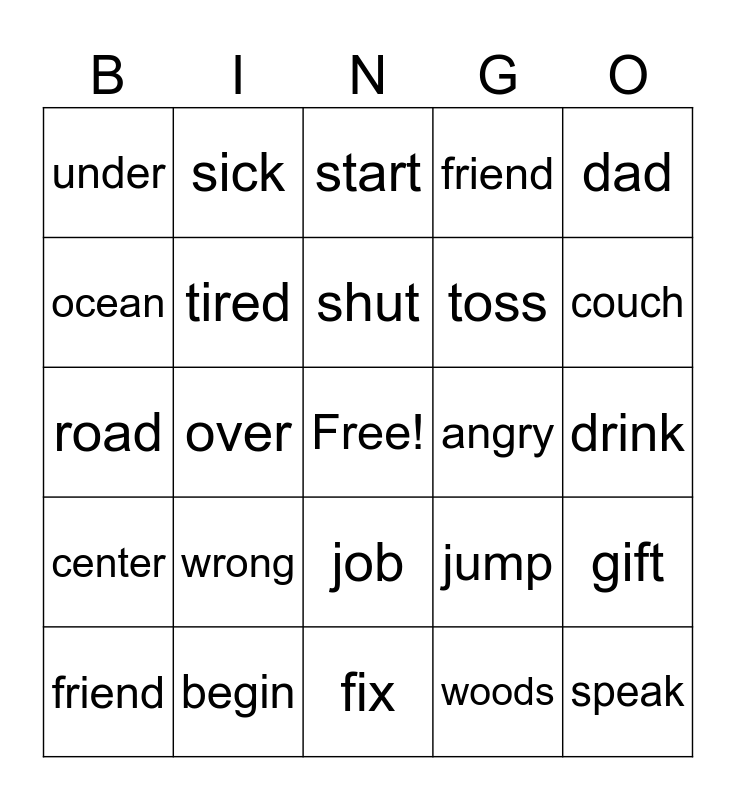 This bingo card has a free space and 24 words: friend, wrong, shut, woods, dad, under, sick, start, angry, drink, road, tired, jump, gift, ocean, begin, fix, friend, couch, center, over, job, toss and speak.