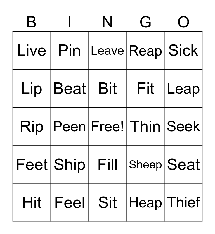 This bingo card has a free space and 25 words: Ship, Sit, Bit, Hit, Sick, Live, Lip, Pin, Thin, Fill, Fit, Rip, Sheep, Seat, Beat, Heat, Seek, Leave, Leap, Peen, Thief, Feel, Feet, Reap and Heap.