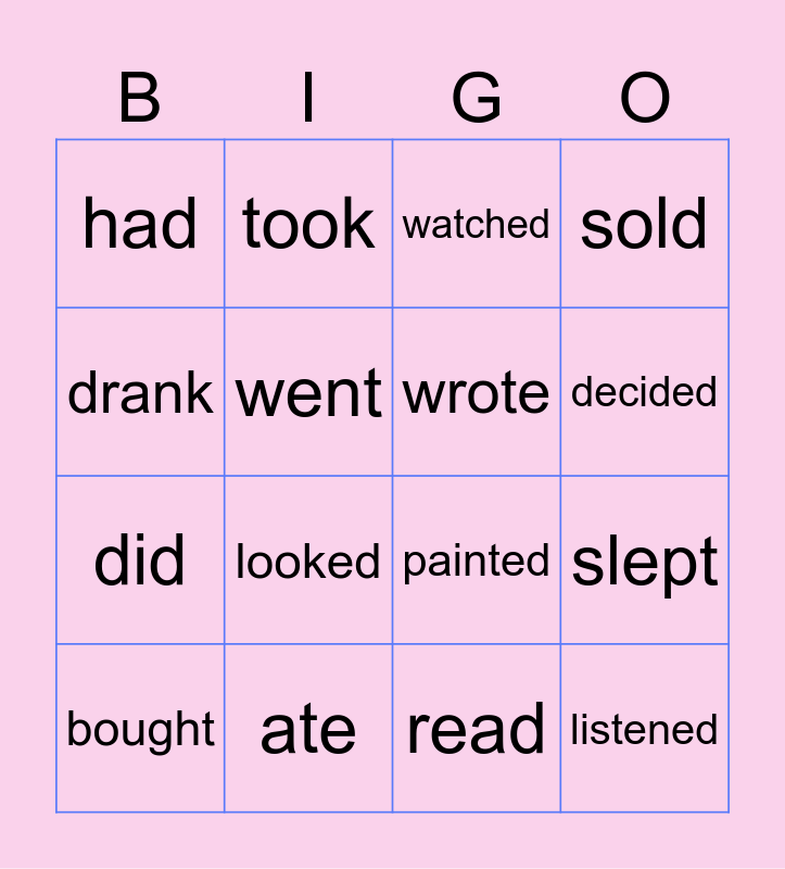 This bingo card has 16 words: ate, slept, watched, had, did, took, painted, read, drank, went, bought, sold, looked, decided, wrote and listened.