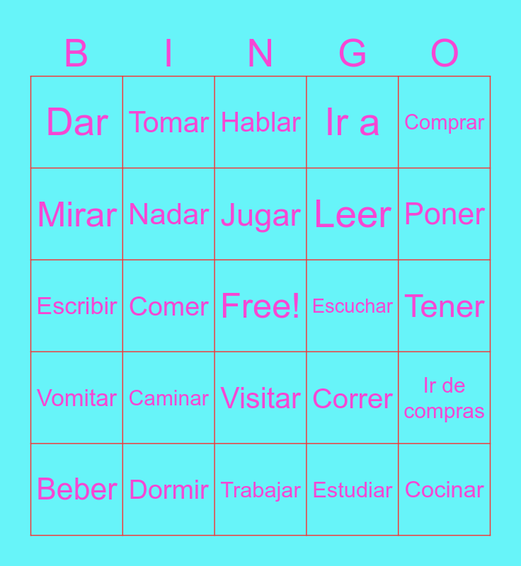 This bingo card has a free space and 24 words: Beber, Caminar, Jugar, Estudiar, Comprar, Dar, Tomar, Hablar, Escuchar, Tener, Escribir, Nadar, Correr, Ir de compras, Mirar, Dormir, Trabajar, Ir a, Poner, Vomitar, Comer, Visitar, Leer and Cocinar.