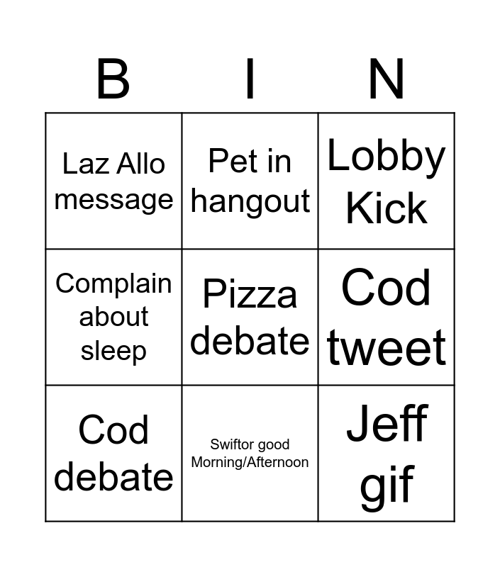 This bingo card has 11 words: Jeff gif, Swiftor good Morning/Afternoon, Pizza debate, Cod debate, Pet in hangout, Lobby Kick, Cod tweet, Complain about work, Complain about sleep, Laz Allo message and 10+ people in sub lounge.