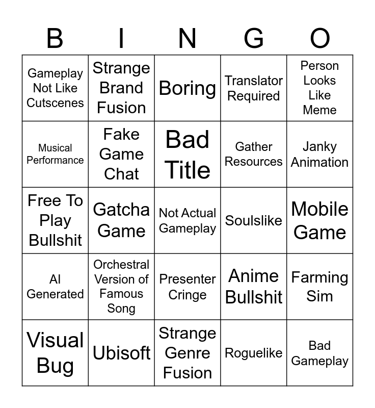 This bingo card has a free space and 24 words: Orchestral Version of Famous Song, Ubisoft, Bad Title, Visual Bug, Person Looks Like Meme, Gameplay Not Like Cutscenes, Musical Performance, Strange Brand Fusion, Soulslike, Presenter Cringe, Gather Resources, Free To Play Bullshit, Anime Bullshit, Farming Sim, Fake Game Chat, Roguelike, Mobile Game, Boring, Janky Animation, Gatcha Game, Bad Gameplay, AI Generated, Translator Required and Strange Genre Fusion.