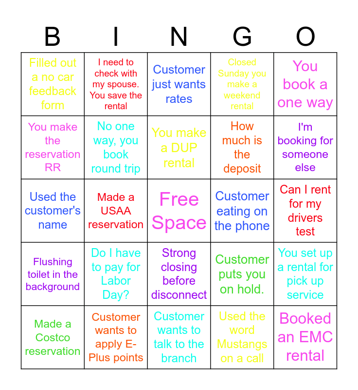 This bingo card has a free space and 24 words: Do I have to pay for Labor Day?, Customer wants to apply E-Plus points, You make a DUP rental, Made a Costco reservation, You book a one way, Filled out a no car feedback form, You make the reservation RR, I need to check with my spouse. You save the rental, Customer eating on the phone, Strong closing before disconnect, How much is the deposit, Used the customer's name, Customer puts you on hold., You set up a rental for pick up service, No one way, you book round trip, Used the word Mustangs on a call, Can I rent for my drivers test, Customer just wants rates, I'm booking for someone else, Made a USAA reservation, Booked an EMC rental, Flushing toilet in the background, Closed Sunday you make a weekend rental and Customer wants to talk to the branch.