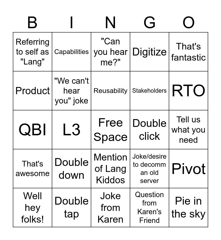 This bingo card has a free space and 29 words: Well hey folks!, Circle back, L3, eNPS, Referring to self as "Lang", "Can you hear me?", "We can't hear you" joke, Double down, Double click, Double tap, Tell us what you need, Pie in the sky, Joke from Karen, Question from Karen's Friend, RTO, Deliverable, Mention of Lang Kiddos, That's awesome, That's fantastic, QBI, Joke/desire to decomm an old server, Roadmap, Stakeholders, Product, Digitize, Capabilities, Pivot, Reusability and Value add.