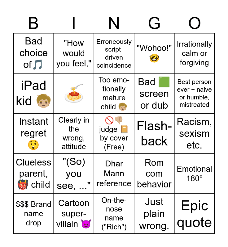 This bingo card has a free space and 33 words: OBVIOUS "plot twist", secretive for no reason, Clearly in the wrong, attitude, ๐๐ผ prop or acting, Clueless parent, ๐น child, ๐, Irrationally calm or forgiving, $$$ Brand name drop, "How would you feel,", Sudden time Skip, Too emo-tionally mature child ๐ง๐ผ, Erroneously script-driven coincidence, Questionable lesson or fired over small thing, Illogical plot point, Flash-back, Best person ever + naive or humble, mistreated, Cartoon super-villain ๐, Instant regret ๐ฒ, "(So) you see, ...", Rom com behavior, Dhar Mann reference, Something ๐๐ผ, Bad choice of๐ต, Racism, sexism etc., On-the-nose name ("Rich"), Epic quote, "Wohoo!" ๐ค, Bad ๐ฉ screen or dub, iPad kid ๐ง๐ผ, Emotional 180ยฐ, Joke is actually funny, Just plain wrong. and Brutal cringe.