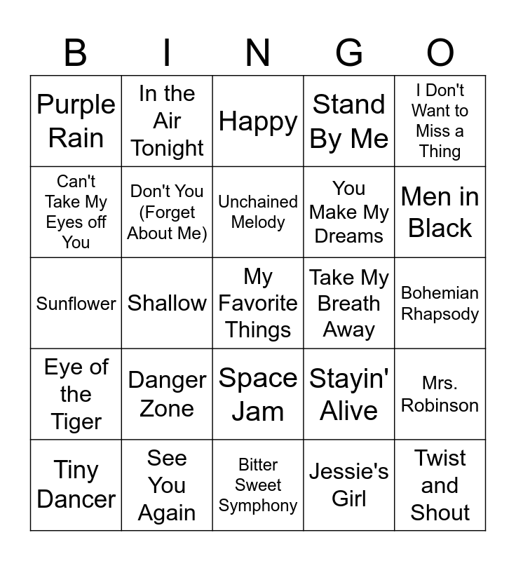 This bingo card has 55 words: What Was I Made For?, Tiny Dancer, You're the One That I Want, Purple Rain, Bitter Sweet Symphony, Footloose, Don't You (Forget About Me), Oh, Pretty Woman, You Make My Dreams, Kiss Me, Stand By Me, Hakuna Matata, 9 to 5, My Girl, Kiss from a Rose, Accidentally in Love, I Don't Want to Miss a Thing, Shallow, Hooked on a Feeling, My Favorite Things, Take My Breath Away, Iris, Stayin' Alive, Happy, I Will Always Love You, Unchained Melody, Jessie's Girl, The Power of Love, Bohemian Rhapsody, Mrs. Robinson, Holding Out for a Hero, I Say a Little Prayer, Ghostbusters, This is ME, Can't Take My Eyes off You, Sunflower, All Star, Eye of the Tiger, Twist and Shout, Everybody Wants to Rule the World, In the Air Tonight, My Heart Will Go On, Son of a Preacher Man, Stuck in the Middle With You, Danger Zone, See You Again, Hallelujah, Over the Rainbow, Gangsta's Paradise, Men in Black, Time Warp, Singin' in the Rain, Pure Imagination, Space Jam and Lose Yourself.