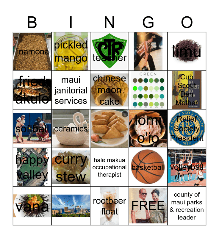 This bingo card has 22 images and 21 words: curry stew, rootbeer float, chinese moon cake, vana, limu, 'inamona, fried akule, pickled mango, lomi o'io, hale makua occupational therapist, softball, basketball, volleyball, maui janitorial services, county of maui parks & recreation leader, Relief Society President, CTR 6 teacher, Cub Scout Den Mother, ceramics, happy valley and FREE.