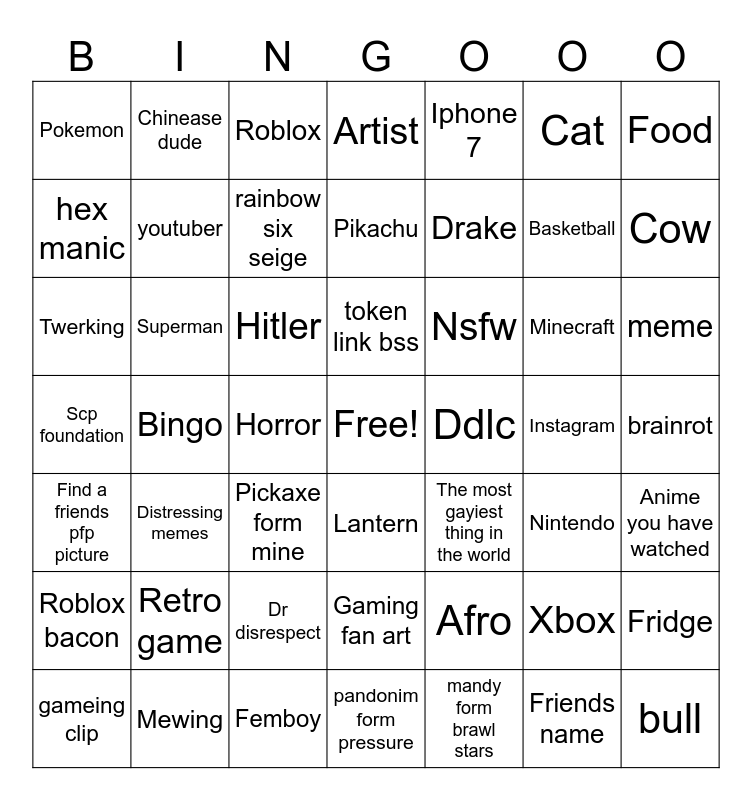 This bingo card has a free space and 48 words: Afro, Basketball, pandonim form pressure, Bingo, Hitler, brainrot, Chinease dude, Mewing, Cat, Lantern, Food, Artist, Minecraft, Nsfw, Roblox bacon, Instagram, hex manic, Cow, Xbox, Iphone 7, Drake, Horror, Pokemon, youtuber, Fridge, rainbow six seige, meme, gameing clip, token link bss, Superman, Friends name, Ddlc, Anime you have watched, Retro game, Scp foundation, The most gayiest thing in the world, Nintendo, Twerking, Pickaxe form mine, Dr disrespect, Find a friends pfp picture, bull, Roblox, Femboy, Pikachu, Gaming fan art, Distressing memes and mandy form brawl stars.