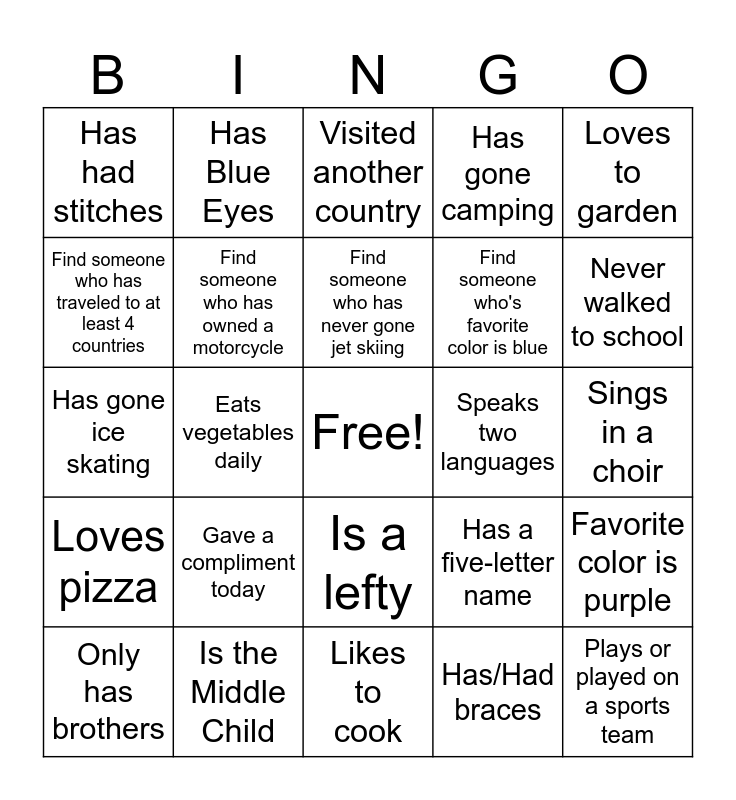 This bingo card has a free space and 45 words: Made your bed today, Plays or played on a sports team, Can whistle, Only has brothers, Has won something, Has/Had braces, Visited another country, Loves to swim, Loves to garden, Is the Middle Child, Has gone camping, Speaks two languages, Is a lefty, Gave a compliment today, Has run a 5K, Likes to cook, Does not drink milk, Has gone ice skating, Has had stitches, Never walked to school, Has Blue Eyes, Has brown eyes, Plays an instrument, Has had stitches, Born in another state, Sings in a choir, Chooses salty over sweet, Has ridden a horse, Has a five-letter name, Loves pizza, Can Draw, Favorite color is purple, Likes to read, Never walked to school, Never gone camping, Eats vegetables daily, Find someone who's first job was a Fast Food restaurant, Find someone who likes Cats better than Dogs, Find someone who has never been on a rollercoaster, Find someone who has never gone jet skiing, Find someone who has traveled to at least 4 countries, Find someone who's favorite color is blue, Find someone who does not have a passport, Find someone who has owned a motorcycle and Find someone who has saved a life.