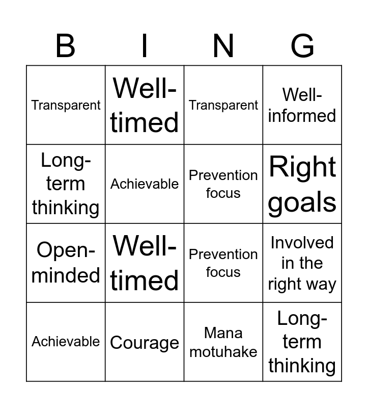 This bingo card has 26 words: Involves the right people, Involved in the right way, Right goals, Well-informed, Long-term thinking, Transparent, Achievable, Well-timed, Mana motuhake, Courage, Open-minded, Prevention focus, Judgement by outcomes, Involves the right people, Involved in the right way, Right goals, Well-informed, Long-term thinking, Transparent, Achievable, Well-timed, Mana motuhake, Courage, Open-minded, Prevention focus and Judgement by outcomes.